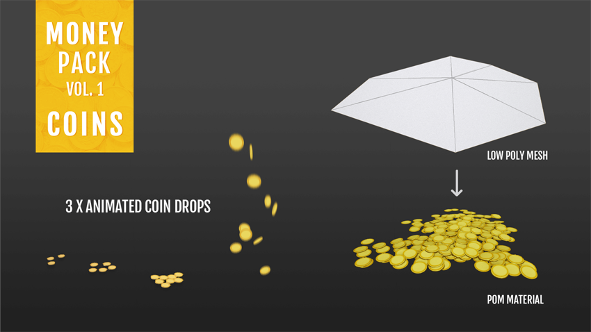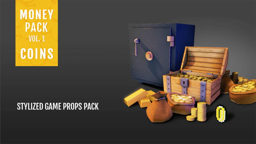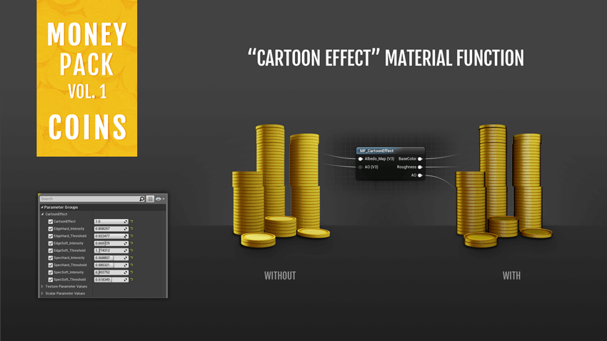 A pack contains 24 Static and 8 Skeletal Meshes ready to be added to your projects (A stylized collection of money related items such as: coins, chests, safes and more). Bundled with Spline Based Pickup Blueprint (great for prototyping coin pickup lines in platformer games ) and "Cartoon Effect" Material Function (to get more stylized look of your assets).