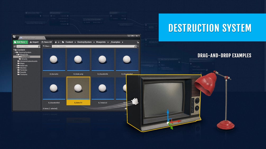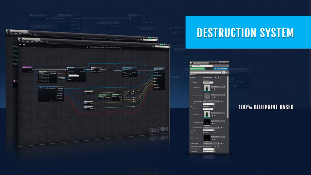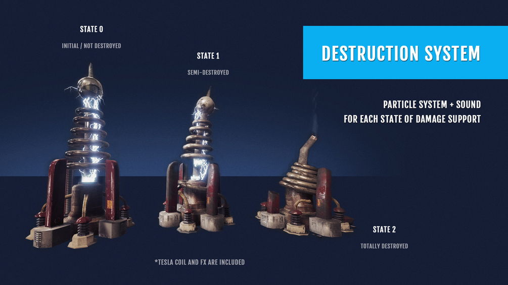 Destruction system uses predefined list of static meshes that represent object’s different states of damage. The system allows you to easily switch from one state to another by applying damage to the object. Additionally, any audio or particle system can be used to make a smooth transition between states.